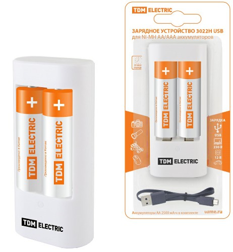 - Зарядное устройство TDM 3022Н (300 mA 2 слота АА/ААА 1 кан.+2xAA2500 USB) (1/100) (SQ1702-0103)