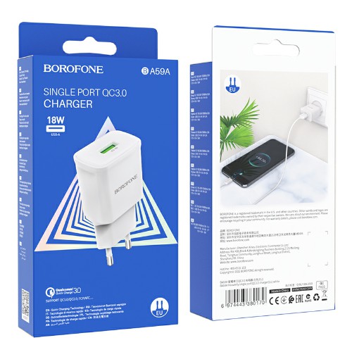 - Блок питания сетевой 1 USB Borofone BA59A, Heavenly, пластик огнестойкий, QC3.0, 18W, цвет: белый (1/35/140) (6974443380170)