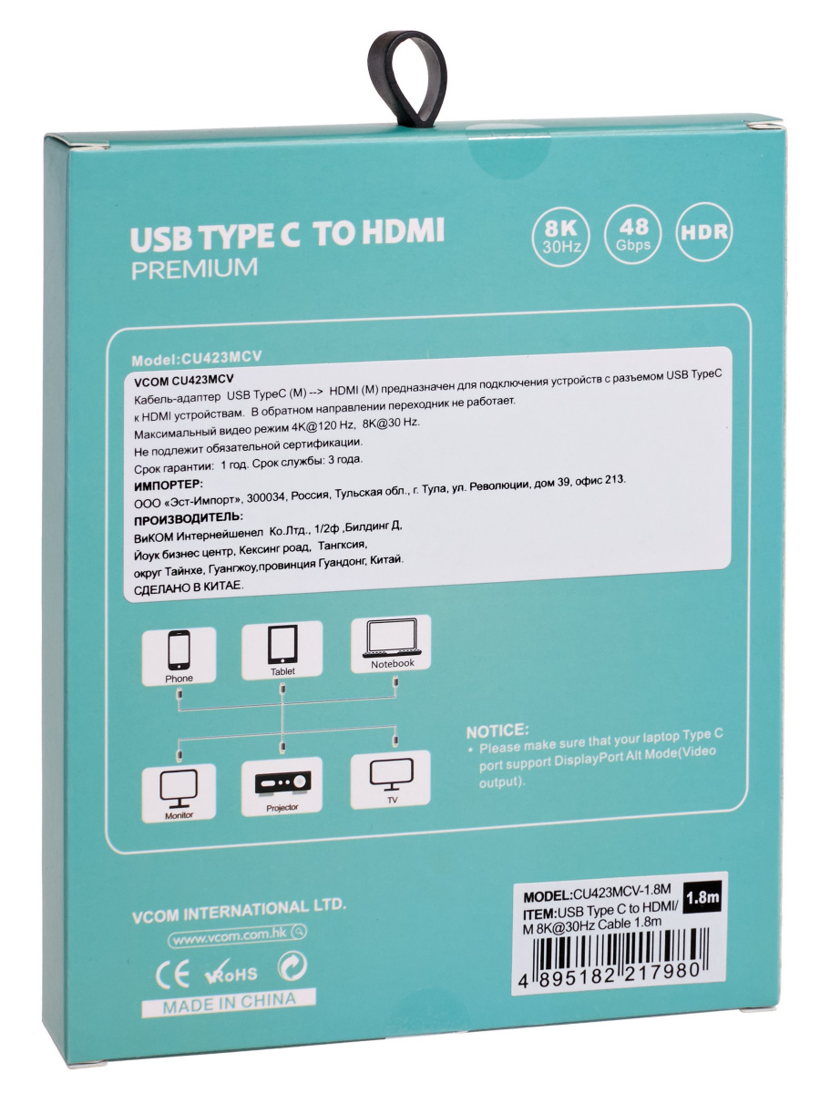 - Кабель-переходник USB 3.1 Type-C(M)--> HDMI A(m) 8K@30Hz, 1.8m ,Alumi Shell,VCOM <CU423MCV-1.8M> (1/50)