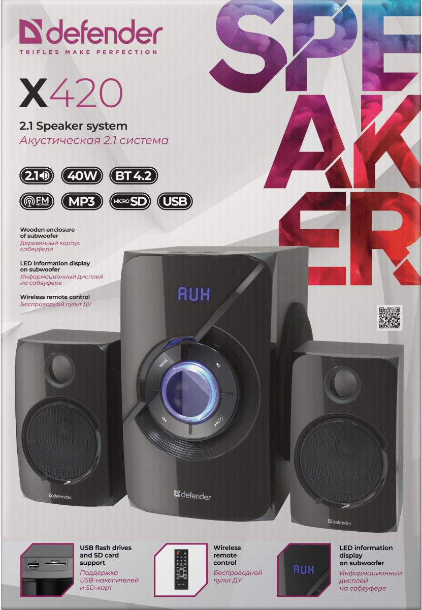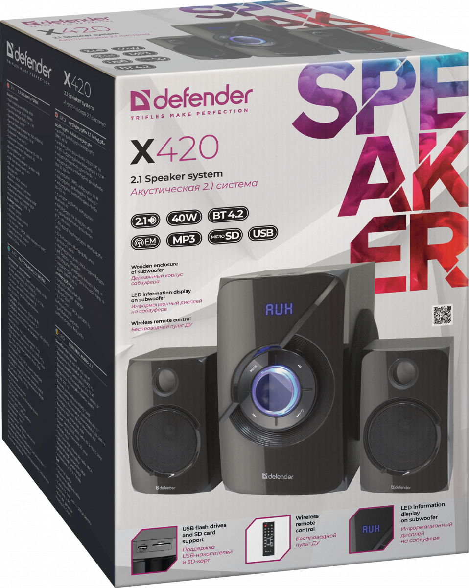 - Активная система DEFENDER 2.1 X420, черный, 40 Вт, Bluetooth, FM/MP3/SD/USB (1/4) (65525)