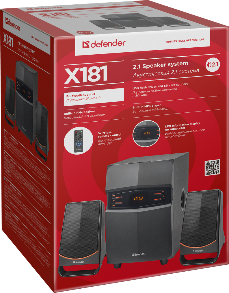 - Акустическая система DEFENDER 2.1 X181, черный, 18Вт, BT/FM/MP3/SD/USB/LED/RC (1/4) (65181)