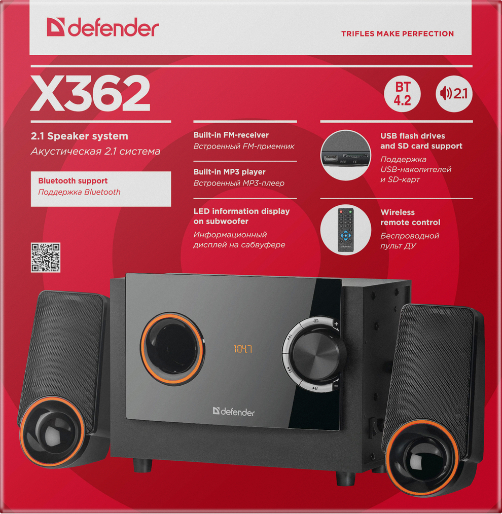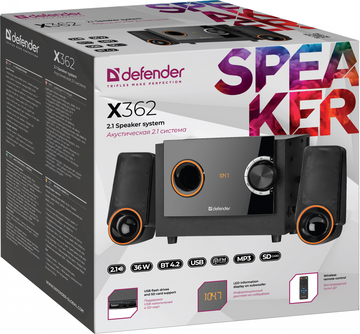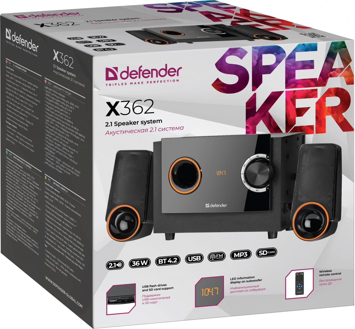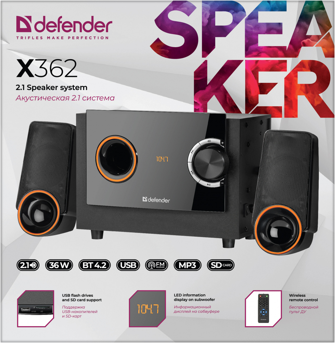- Акустическая система DEFENDER 2.1 X362, черный, 36Вт, BT/FM/MP3/SD/USB/LED/RC (1/4) (65362)
