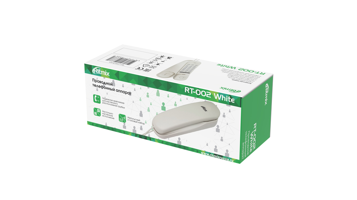 - Телефон проводной RITMIX RT-002 white узкий корпус, кнопки на трубке, Сброс/Пауза/Повтор/Регулировка громкости, настенное крепление (1/25) (80002230)