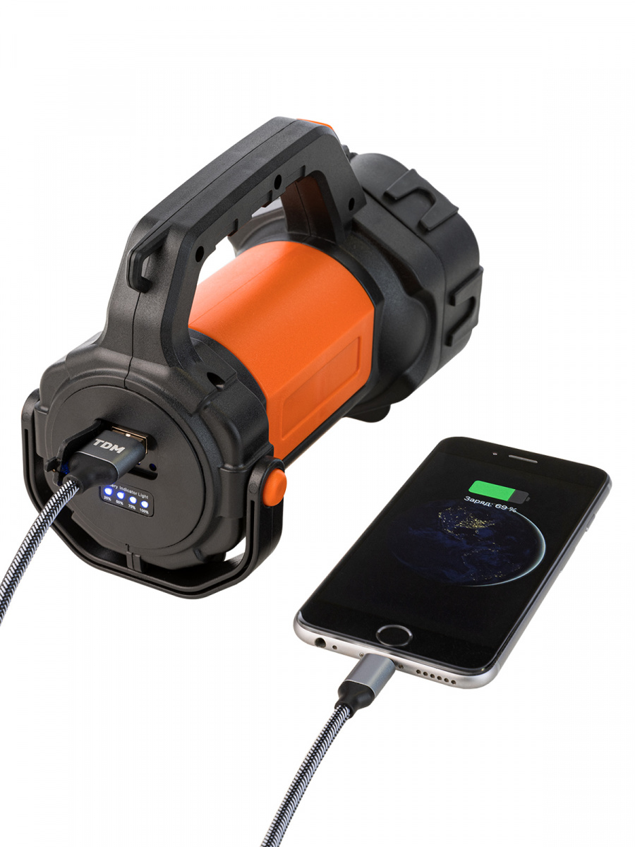 - Фонарь TDM светодиодный "Прожектор 6", 5 Вт LED+10 SMD+9 SMD, 400 лм, 3,7 В 2x18650 2,4 А*ч, USB, (1/24) (SQ0350-0059)