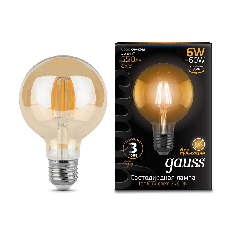 - Лампа светодиодная GAUSS Filament G95 6W 550lm 2400К Е27 golden 1/20 (105802006)