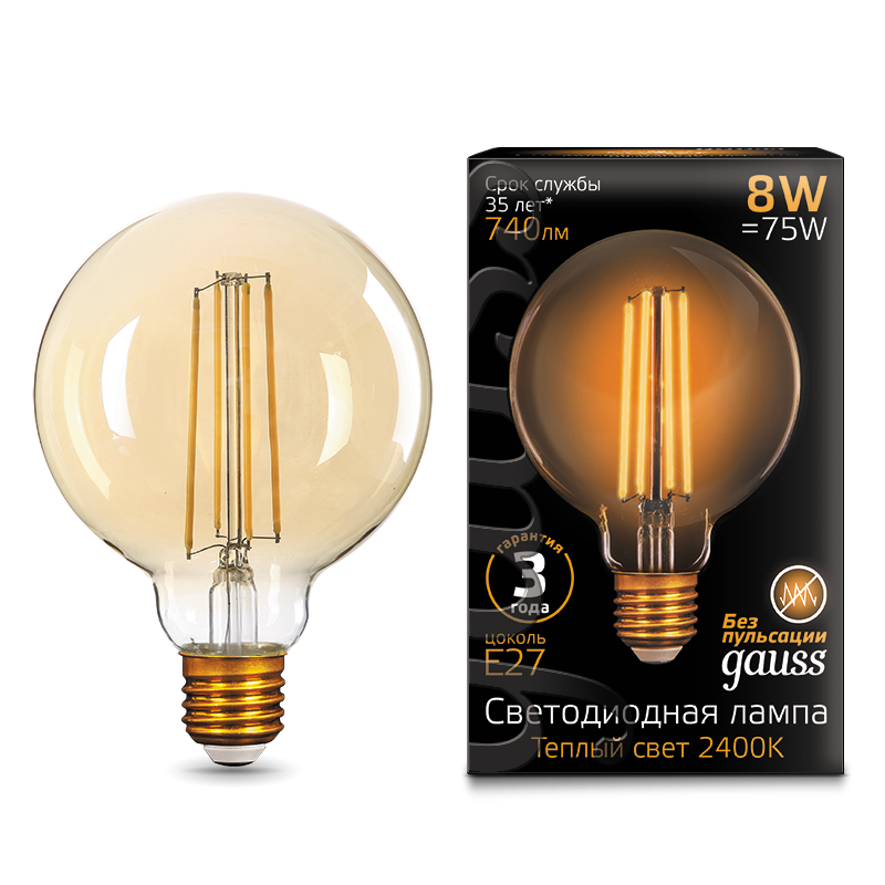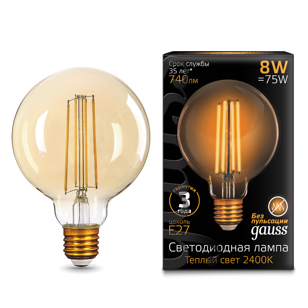 - Лампа светодиодная GAUSS Filament G95 8W 740lm 2400К Е27 golden 1/20 (105802008)