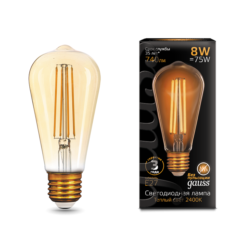 - Лампа светодиодная GAUSS Filament ST64 8W 740lm 2400К Е27 golden 1/10/40 (157802008)