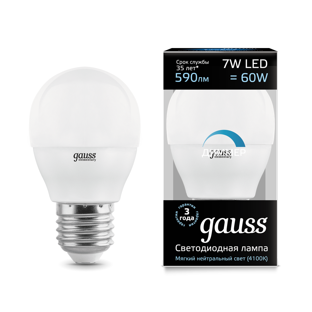 - Лампа светодиодная GAUSS Шар 7W 590lm 4100К Е27 диммируемая 1/10/100 (105102207-D)