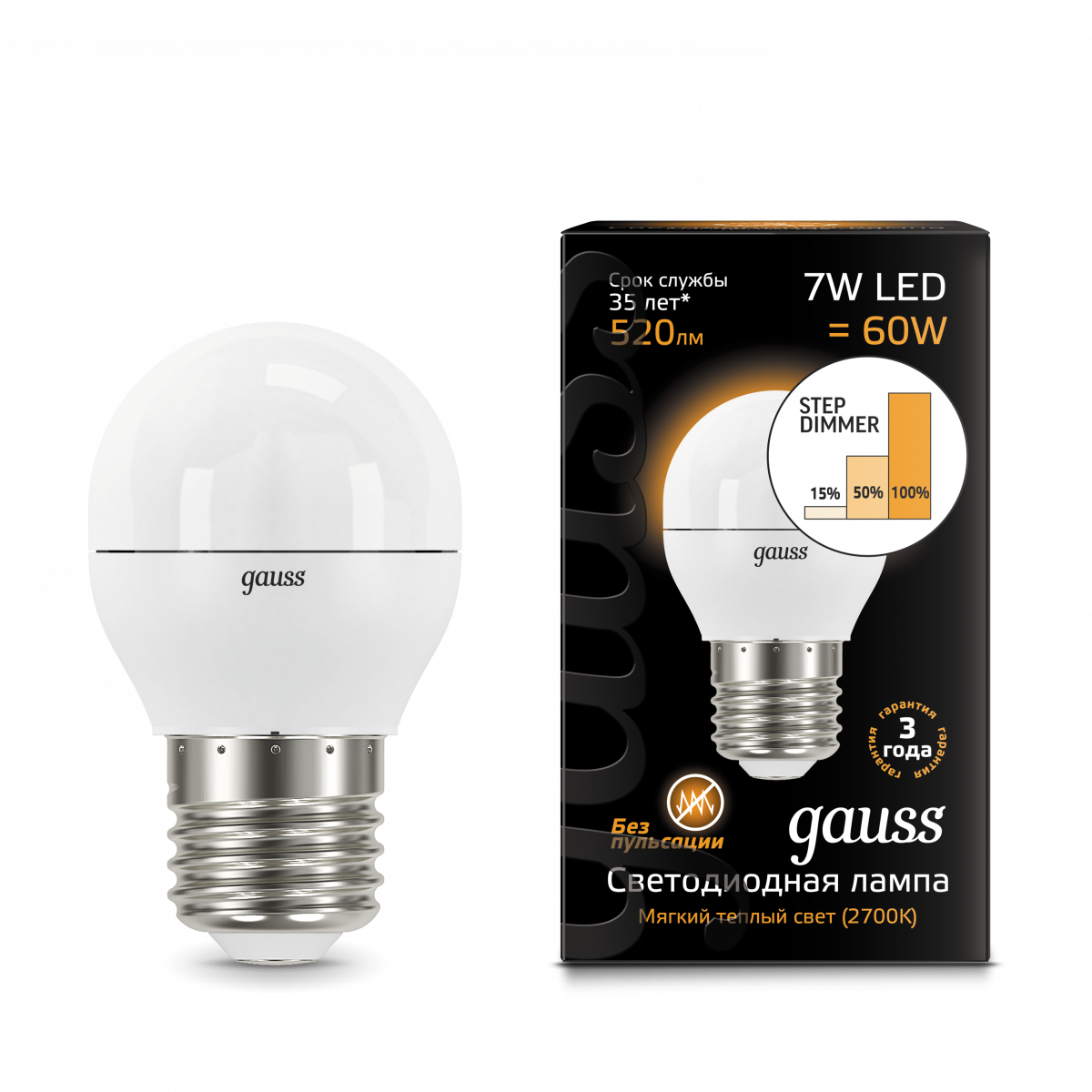 - Лампа светодиодная GAUSS Шар 7W 520lm 3000K Е27 шаг. диммирование 1/10/100 (105102107-S)