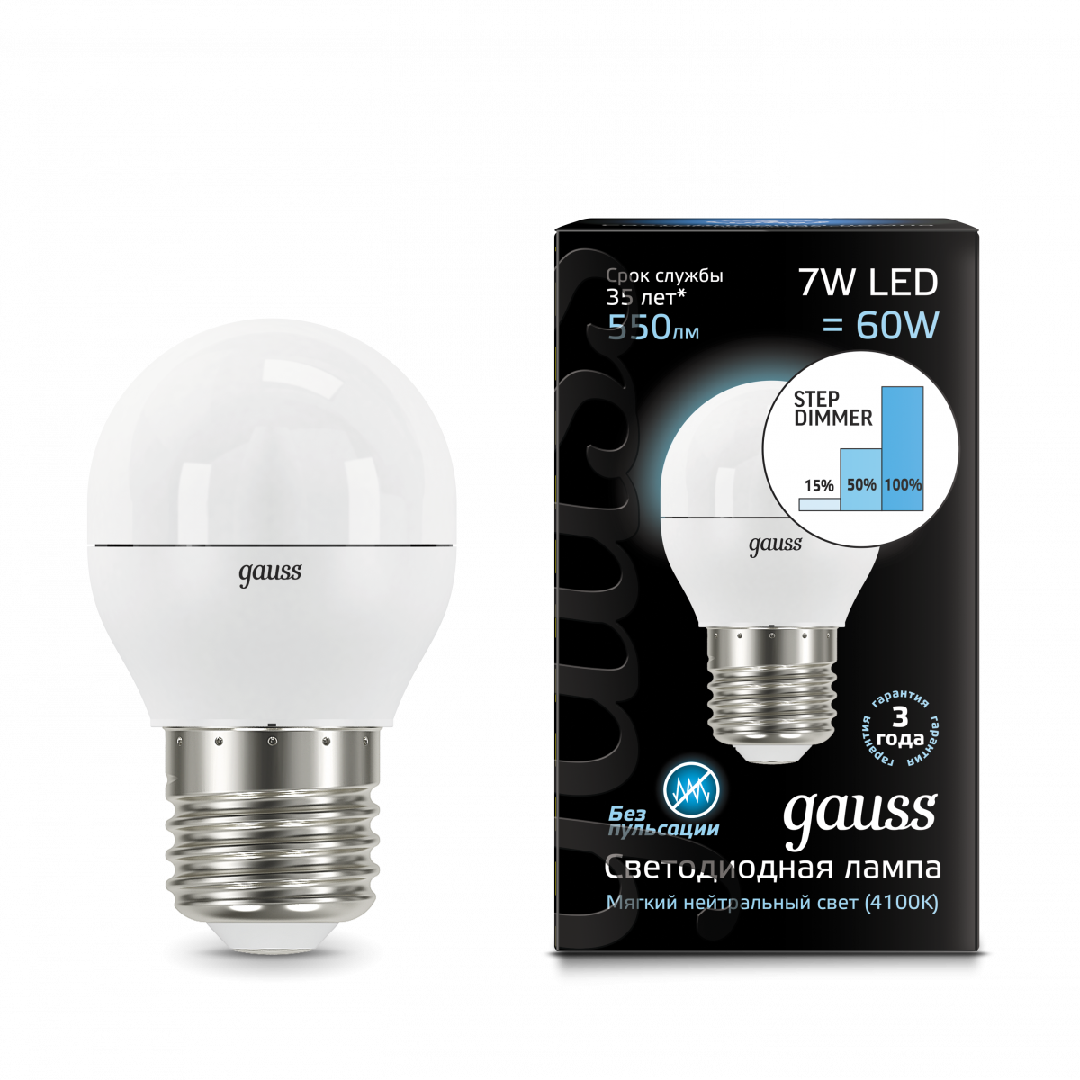- Лампа светодиодная GAUSS Шар 7W 550lm 4100K Е27 шаг. диммирование 1/10/100 (105102207-S)