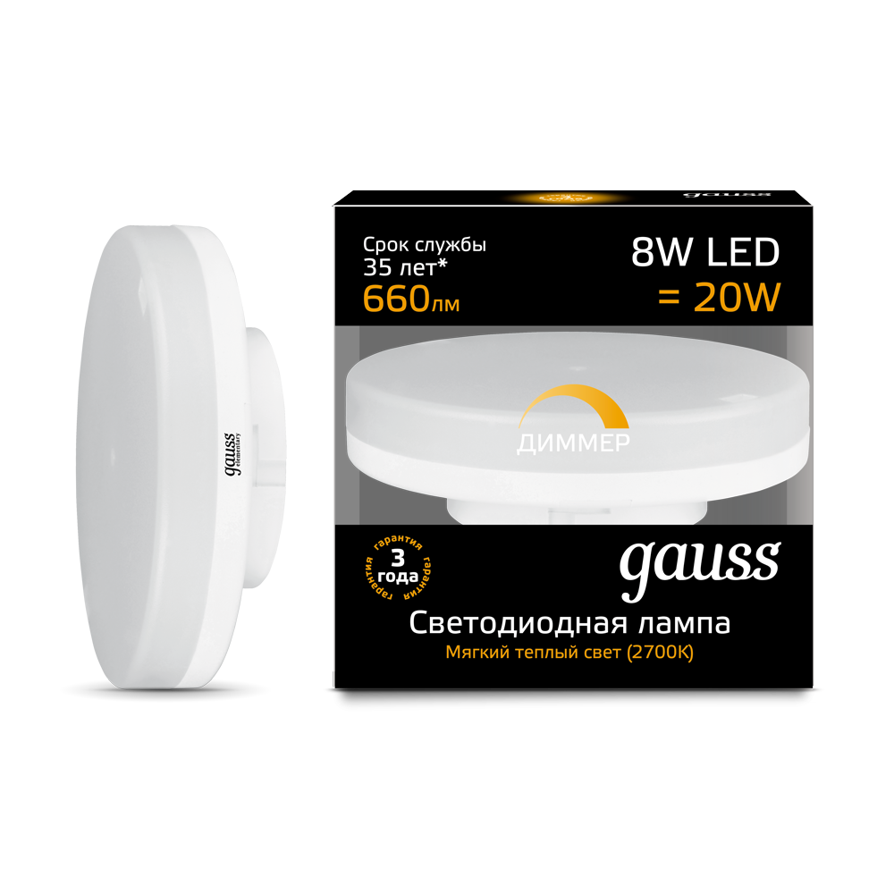 - Лампа светодиодная GAUSS GX53 8W 660lm 3000K диммируемая 1/10/100 (108408108-D)