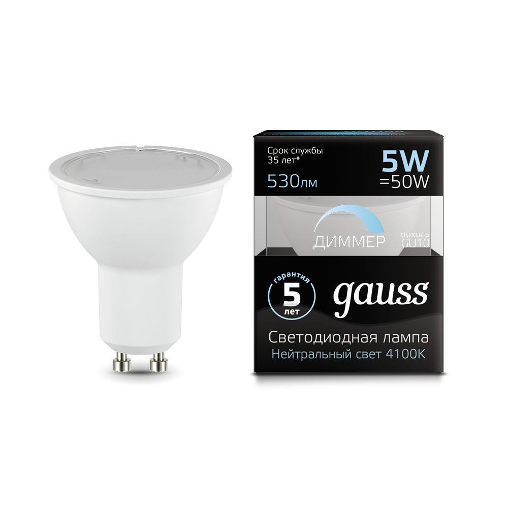 - Лампа светодиодная GAUSS MR16 5W 530lm 4100K GU10 диммируемая 1/10/100 (101506205-D)