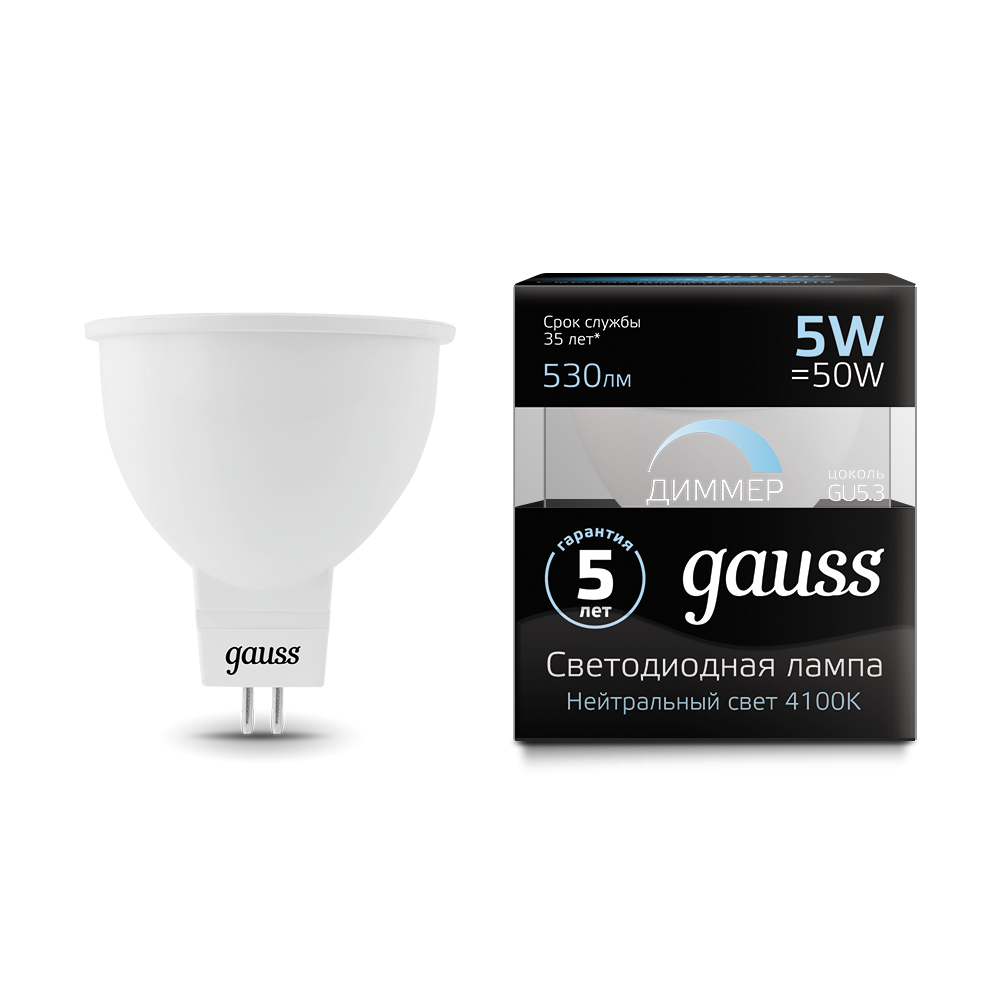 - Лампа светодиодная GAUSS MR16 5W 530lm 4100K GU5.3 диммируемая 1/10/100 (101505205-D)