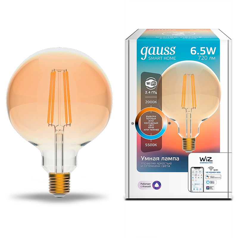 - Лампа светодиодная GAUSS Smart Home, филамент, Wi-Fi и голосовое управление, програм-ние режимов, диммер, DIM+CCT E27 G95 Golden 6,5 Вт 2000-5500 (1340112)