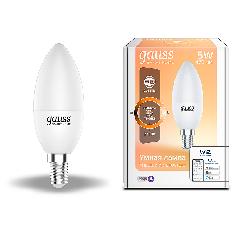 - Лампа светодиодная GAUSS Smart Home, Wi-Fi и голосовое управление, програм-ние режимов, диммер, DIM E14 C37 5 Вт 2700К 1/10/40 (1100112)