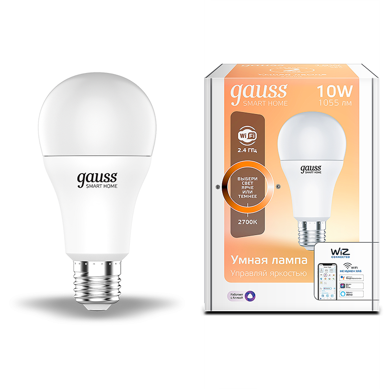 - Лампа светодиодная GAUSS Smart Home, Wi-Fi и голосовое управление, програм-ние режимов, диммер, DIM E27 A60 10 Вт 2700К 1/10/40 (1070112)