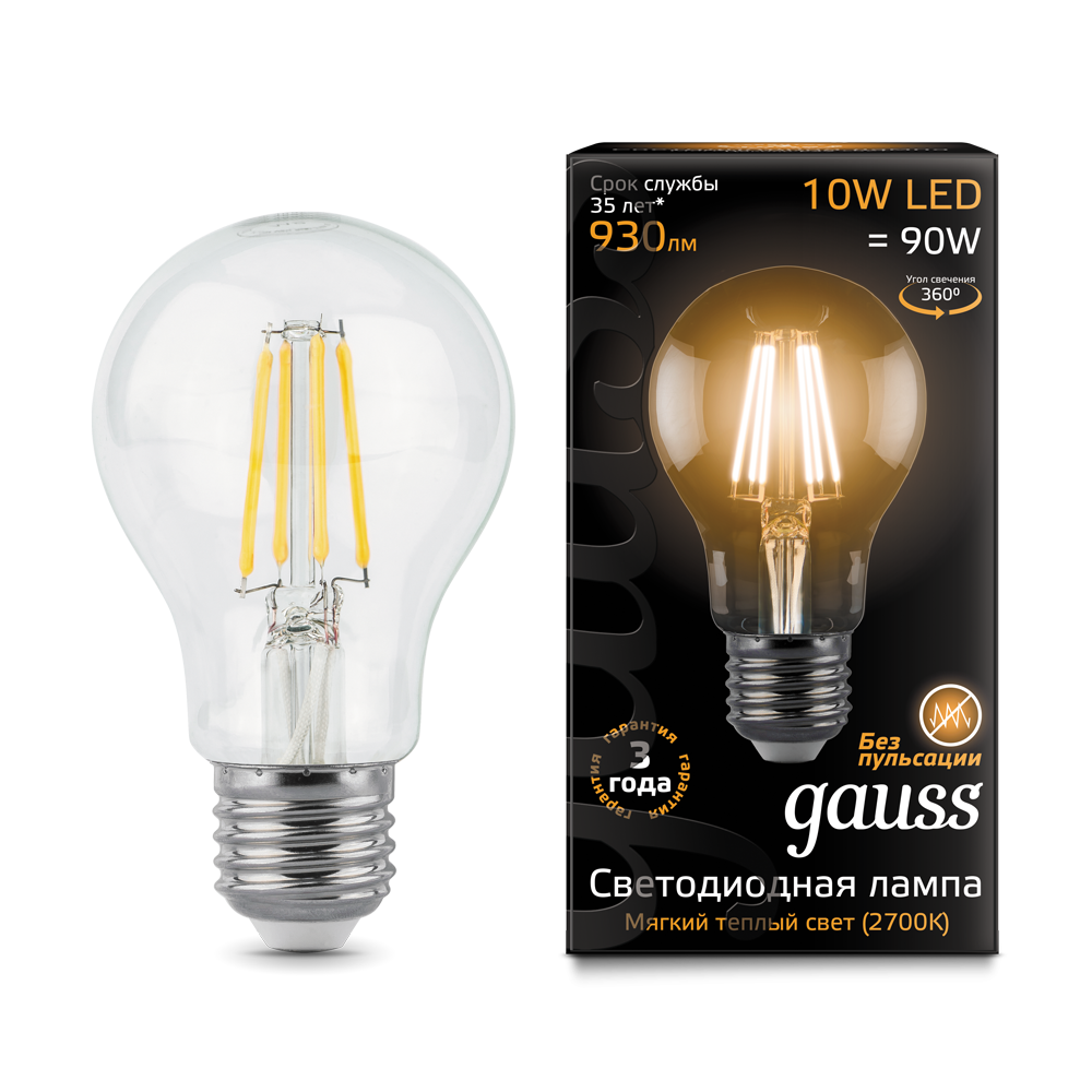 - Лампа светодиодная GAUSS Filament А60 10W 930lm 2700К Е27 1/10/40 (102802110)