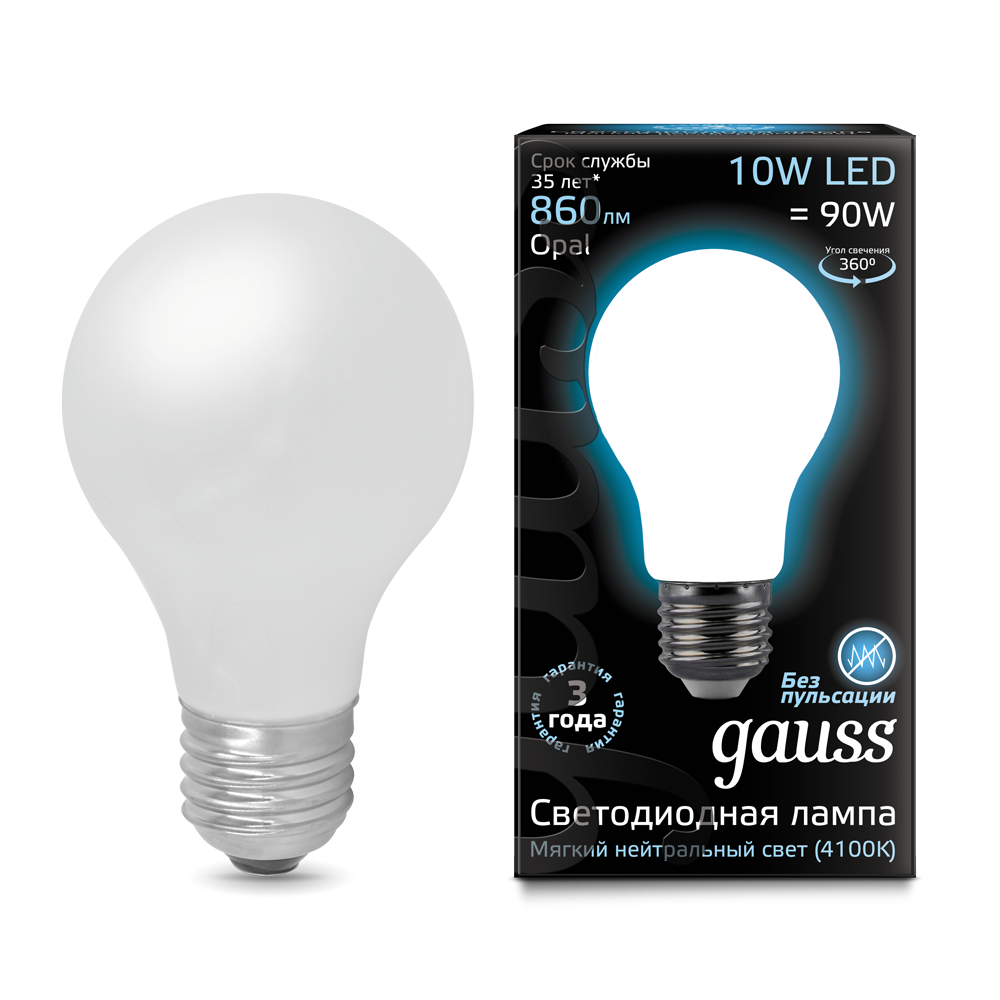 - Лампа светодиодная GAUSS Filament А60 10W 860lm 4100К Е27 milky 1/10/40 (102202210)