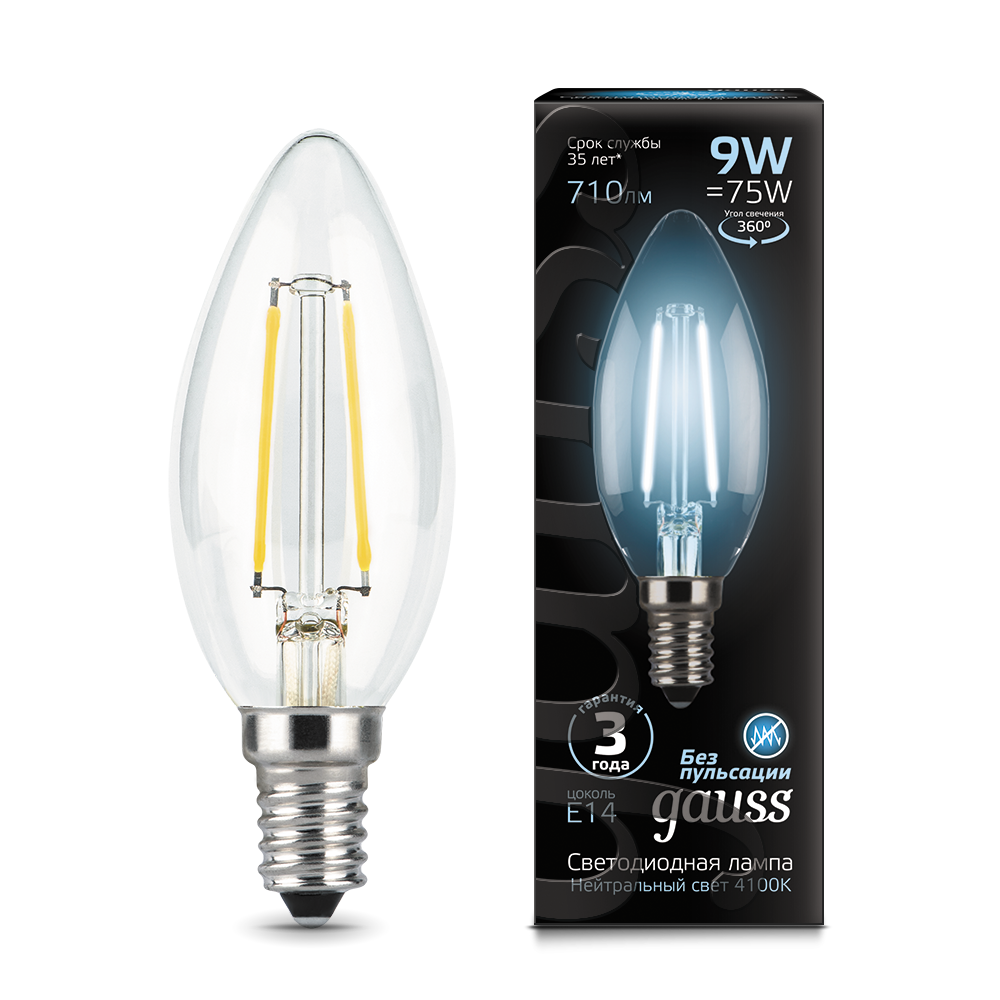 - Лампа светодиодная GAUSS Filament Свеча 9W 710lm 4100К Е14 1/10/50 (103801209)