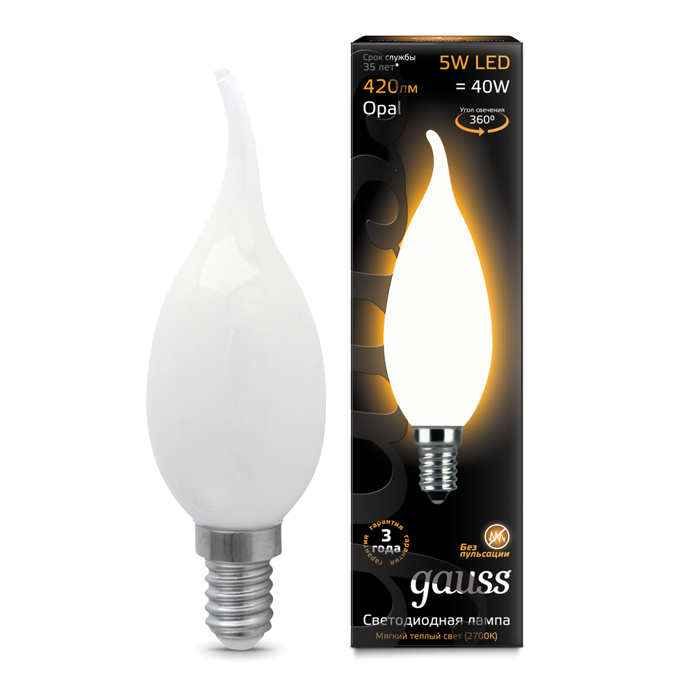 - Лампа светодиодная GAUSS Filament Свеча на ветру 5W 420lm 2700К Е14 milky 1/10/50 (104201105)