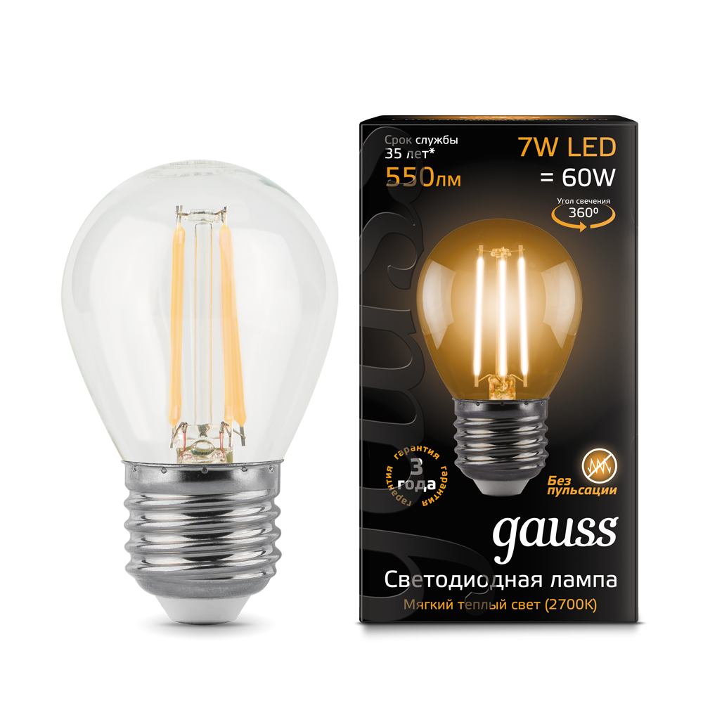 - Лампа светодиодная GAUSS Filament Шар 7W 550lm 2700К Е27 1/10/50 (105802107)
