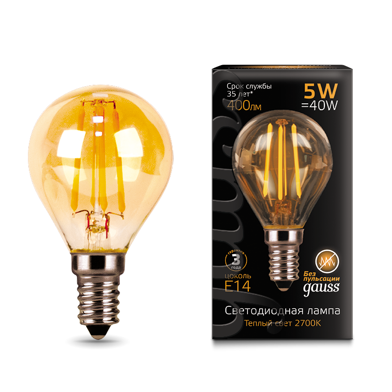 - Лампа светодиодная GAUSS "Филамент" Шар 5W 400lm 2700К Е14 golden 1/10/50 (105801005)