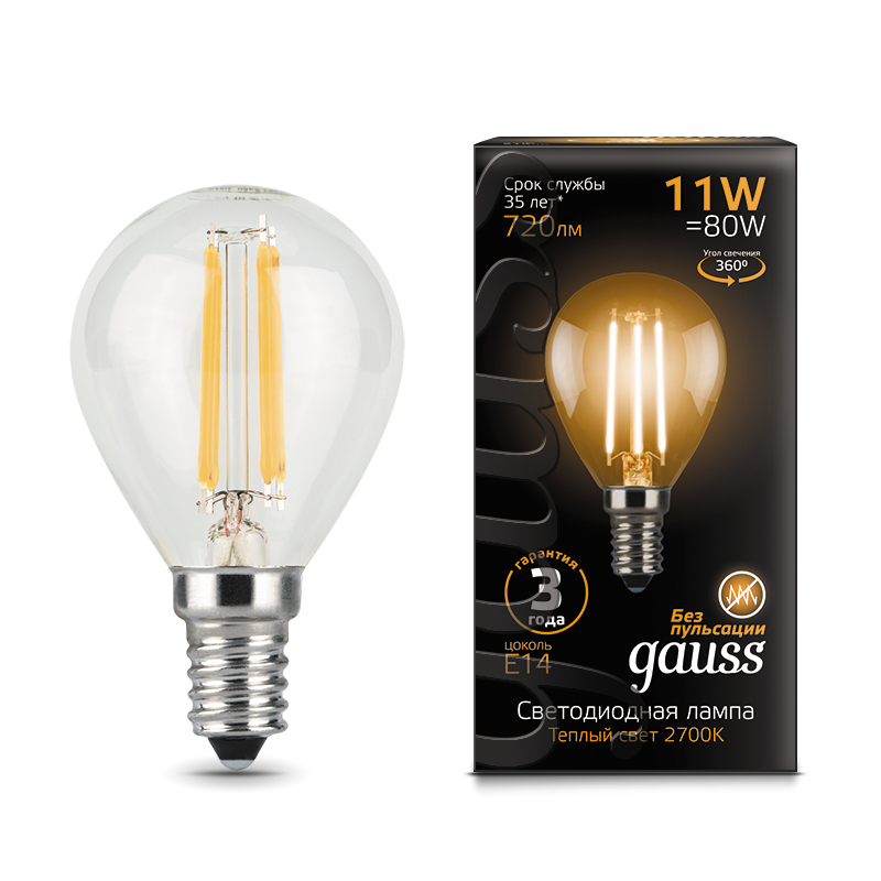 - Лампа светодиодная GAUSS Filament Шар 11W 810lm 2700К Е14 1/10/50 (105801111)