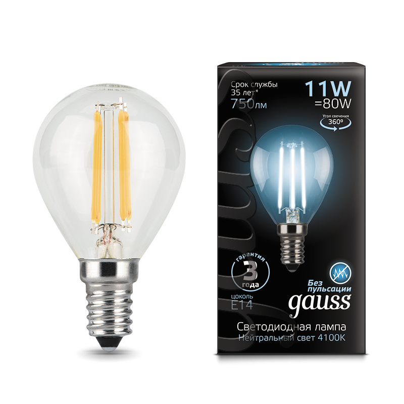 - Лампа светодиодная GAUSS Filament Шар 11W 830lm 4100К Е14 1/10/50 (105801211)