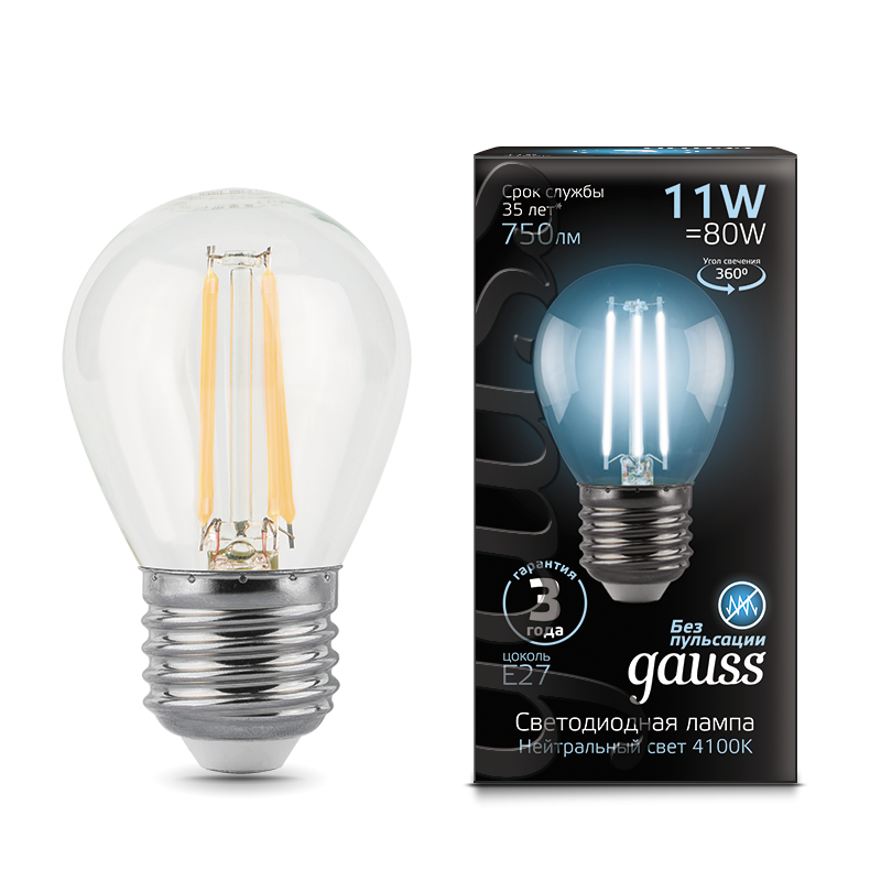 - Лампа светодиодная GAUSS Filament Шар 11W 830lm 4100К Е27 1/10/50 (105802211)
