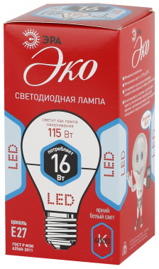 - Лампа светодиодная ЭРА A60-16W-840-E27 16Вт цоколь:E27 4000K 220В колба:A60 (упак.:3шт) (Б0031707)