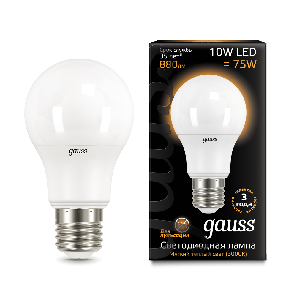 - Лампа светодиодная GAUSS A60 10W 880lm 3000K E27 1/10/50 (102502110)