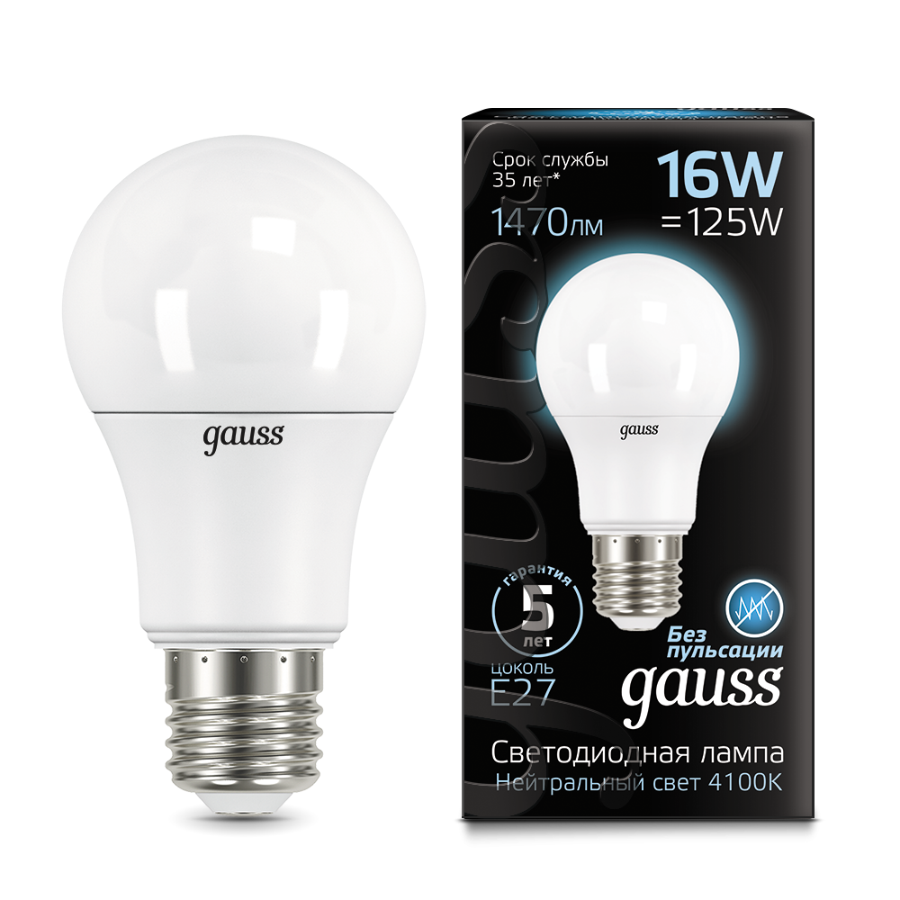 - Лампа светодиодная GAUSS A60 16W 1520lm 4100K E27 1/10/50 (102502216)