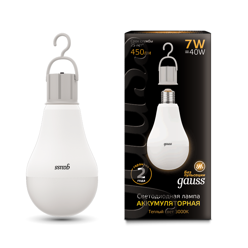 - Лампа светодиодная GAUSS A60 7W 450lm 3000K E27 с Li-Ion аккумулятором 1/10/60 (102402107)