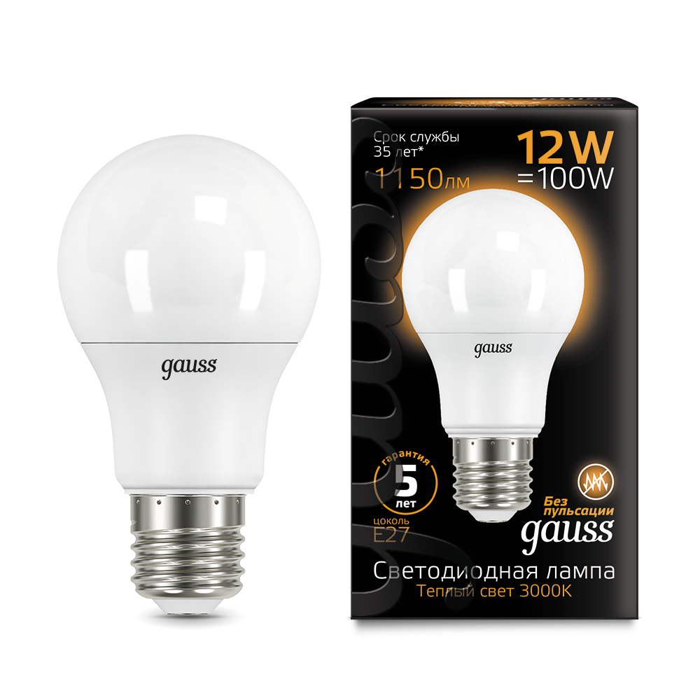 - Лампа светодиодная GAUSS A60 12W 1150lm 3000K E27 1/10/50 (102502112)