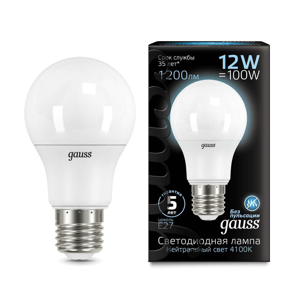- Лампа светодиодная GAUSS A60 12W 1200lm 4100K E27 1/10/50 (102502212)