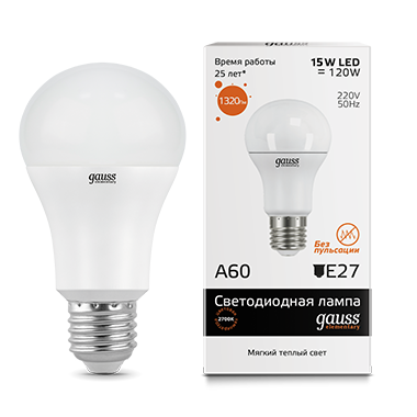 - Лампа светодиодная GAUSS Elementary A60 15W 1320lm 3000K E27 1/10/50 (23215)