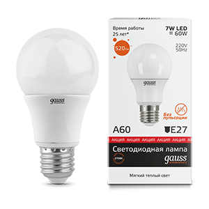 - Лампа светодиодная GAUSS Elementary A60 7W 520lm 3000K E27 1/10/50 (23217A)