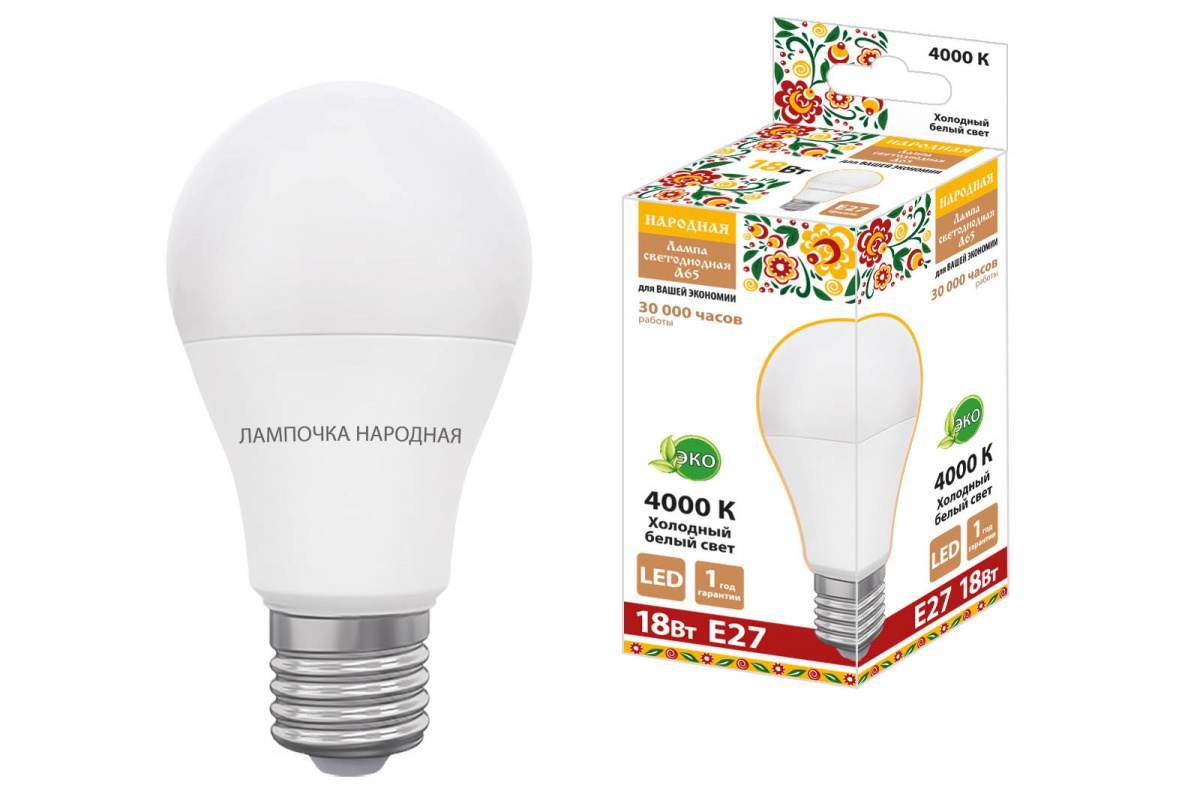 - Лампа светодиодная НАРОДНАЯ НЛ-LED230-A65-18 Вт-230 В-4000 К-Е27, (65х128 мм) (1/100) (SQ0340-1636)