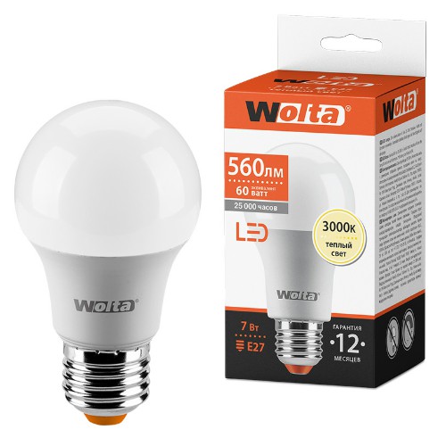 - Лампа светодиодная WOLTA Груша A55 7Вт 3000К 560лм Е27 1/50 (25Y55BL7E27)