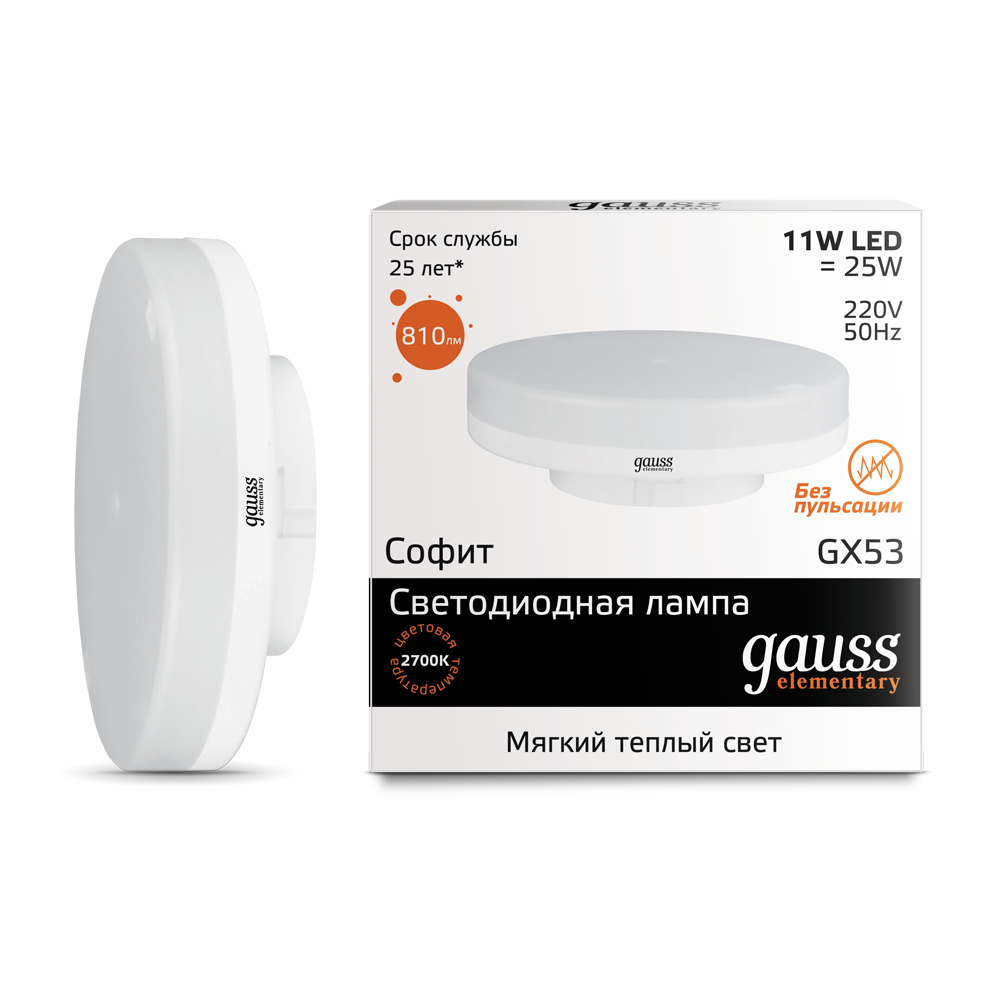- Лампа светодиодная GAUSS Elementary GX53 11W 810lm 3000K 1/10/100 (83811)