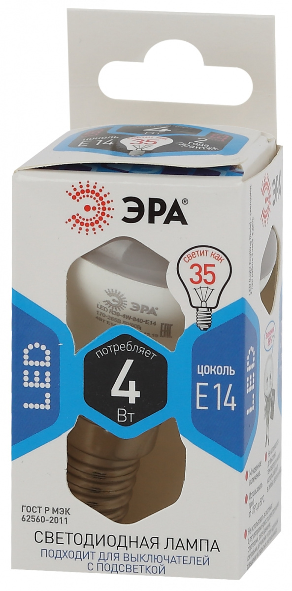 - Лампа светодиодная ЭРА STD LED R39-4W-840-E14 Е14 / Е14 4Вт рефлектор нейтральный белый свeт (1/100) (Б0047934)