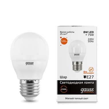 - Лампа светодиодная GAUSS Elementary Шар 8W 520lm 3000K Е27 1/10/100 (53218)