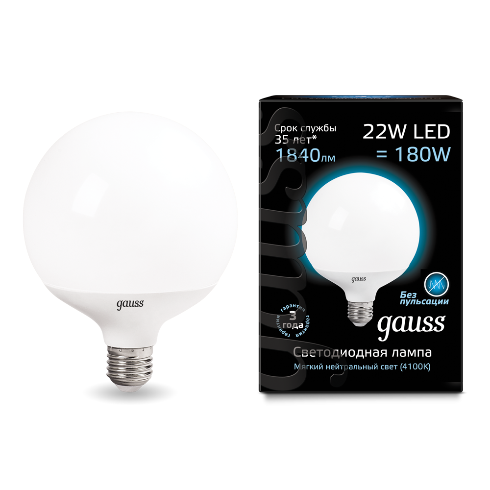 - Лампа светодиодная GAUSS G125 22W 1900lm 4100K E27 1/10 (105102222)