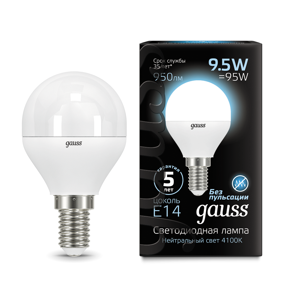 - Лампа светодиодная GAUSS Шар 9.5W 950lm 4100K E14 1/10/100 (105101210)