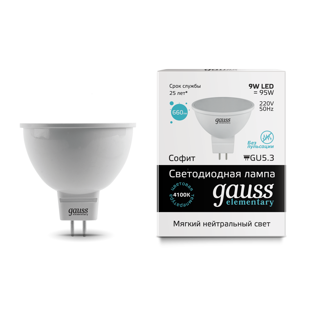 - Лампа светодиодная GAUSS Elementary MR16 9W 660lm 4100K GU5.3 1/10/100 (13529)