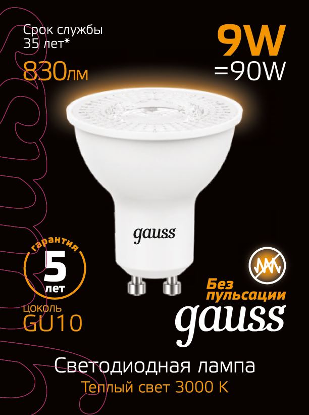- Лампа светодиодная GAUSS MR16 9W 830lm 3000K GU10 1/10/100 (101506109)