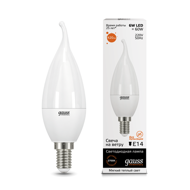 - Лампа светодиодная GAUSS Elementary Свеча на ветру 6W 420lm 3000K Е14 1/10/50 (34116)
