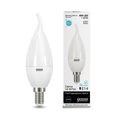 - Лампа светодиодная GAUSS Elementary Свеча на ветру 6W 450lm 4100K Е14 1/10/50 (34126)