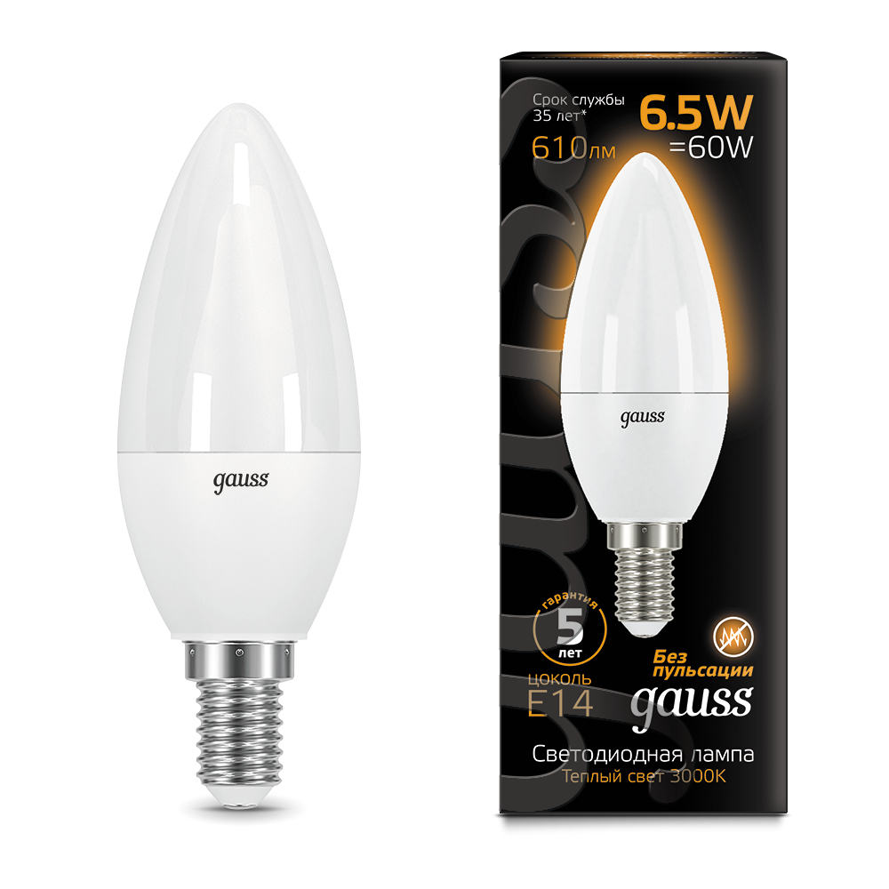 - Лампа светодиодная GAUSS Свеча 6.5W 520lm 3000К E14 1/10/100 (103101107)