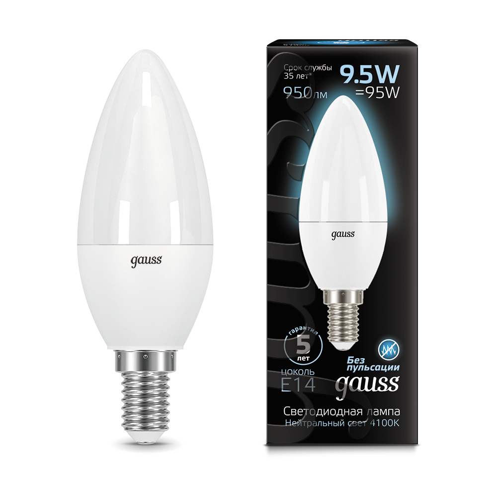 - Лампа светодиодная GAUSS Свеча 9.5W 950lm 4100К E14 1/10/100 (103101210)